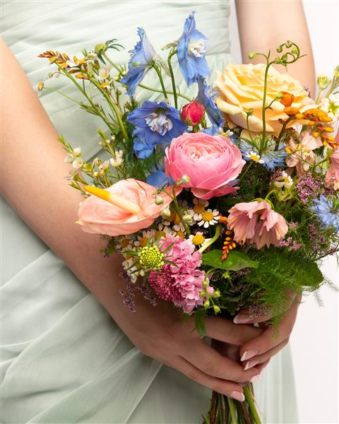 We use the same dreamy palette of colourful pastels – think soft pinks, blushes, lavenders, and creams – and the same garden-fresh vibe. Each bouquet features a curated mix of seasonal wild blooms (like delphinium, scabious, nigella, and petite roses) hand-tied for that loose, organic feel.