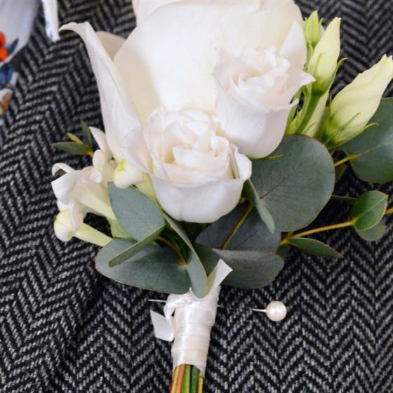 The gents buttonhole is hand crafted using pure white Rose with Lisianthus for a contrasting texture finished in ivory ribbon.