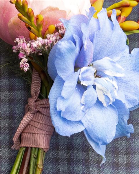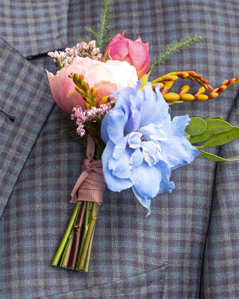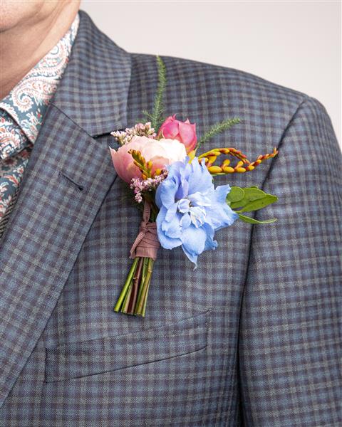 A mini wildflower moment for the groom (or grooms!), featuring a statement bloom like a delphinium or crocosmia, paired with delicate sprigs for a natural, organic touch