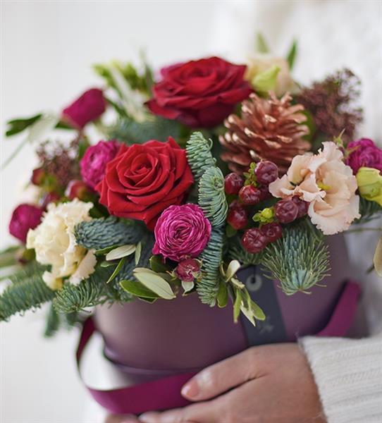 A very chic festive hatbox, just bursting with seasonal Christmas flowers including Roses, Lisianthus and hypericum. Hand crafted and hand delivered, the flowers are presented in a quality hat-box, it is sure to brighten anyones day.