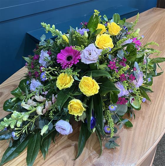 Colour for the celebration of life. Using a range of bright country flowers, this spray is a beautiful representation of a cherished life lived.