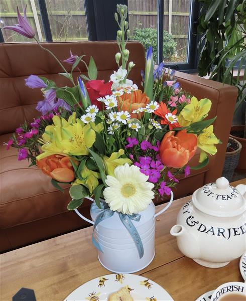 All thats the best about Spring, our mini metal milk churn contains a colourful floral display incluidng tulips , Alstromeria, Roses, Gerbera & Sweet William