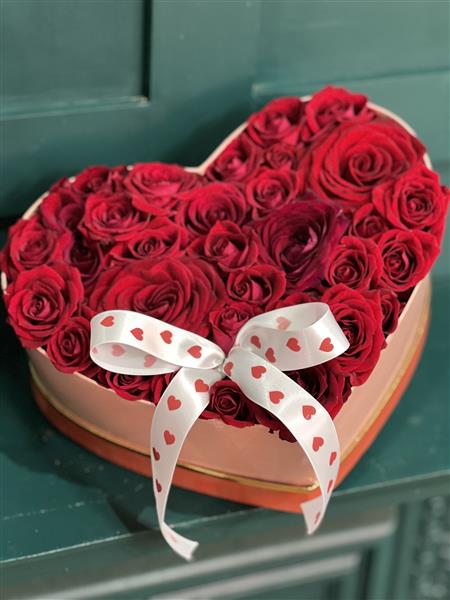 Beautiful large headed red roses bursting from a heart shaped hat box, this is a true declaration of love and passion. Approx 24x15cm