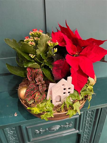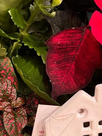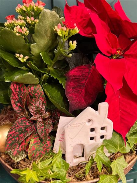 A lovely selection of Christmas flowers including poinsettia with a cute house tea light.