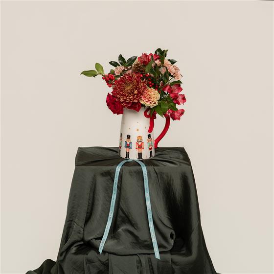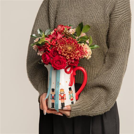 He's traded nuts for blossoms! Meet the most charming guard on your holiday mantel—a stately nutcracker jug, now overflowing with a jubilant explosion of Christmas flowers from our artisan studio.
