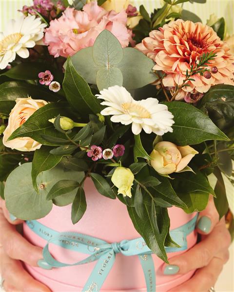 A very popular unique gift of a lovely hand crafted hatbox of flowers in beautiful pastel colours.