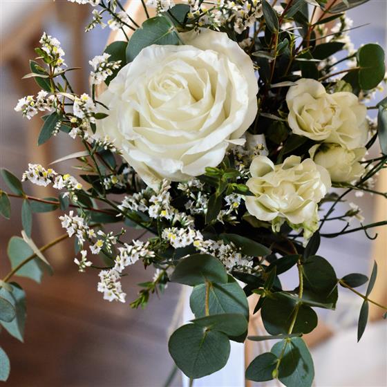 Decorative floral Pew End using White Rose and Lisianthus. Build the scene using multiple pew ends to make the aisle look its most beautiful.