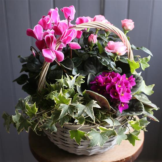 A basket bursting with pretty pink plants and contrasting foliage. A lovely long lasting gift.