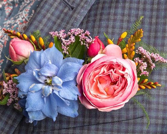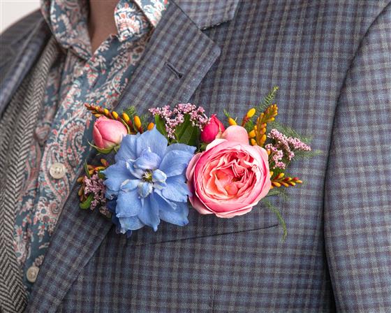 A mini wildflower moment for the groom (or grooms!), featuring a statement bloom like a delphinium or crocosmia, paired with delicate sprigs for a natural, organic touch.