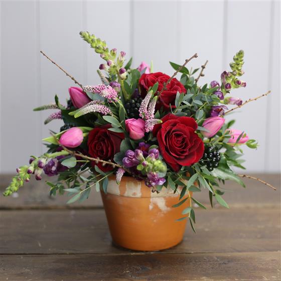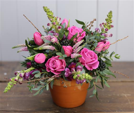 A fully lined and water tight terracotta pot bursting with gorgeous flowers and foliage.