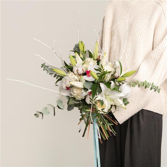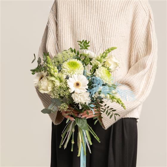 Capture the silent, sparkling beauty of a winter morning. 'The Frost Kiss' is an ethereal arrangement of pristine white roses, delicate snapdragons, and frothy florets, artfully woven with unique frost-blue fern and silvery foliage. This bouquet doesn't just bring the outdoors in—it captures the very magic of the season. A breathtaking centerpiece for your holiday table or a sophisticated gift that brings a touch of serene, wintry elegance to any home throughout the cold months.