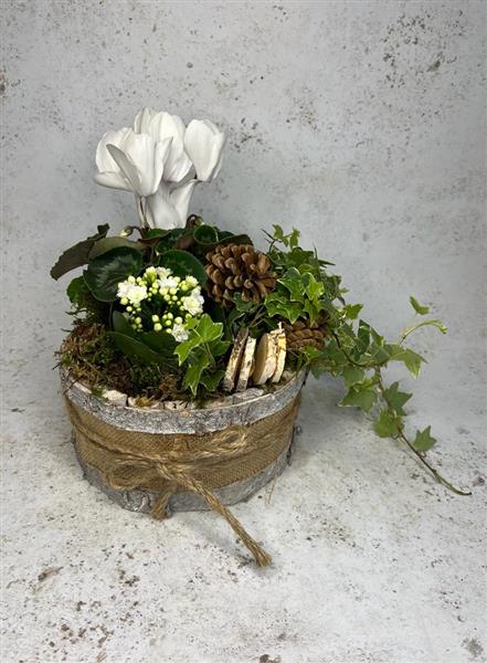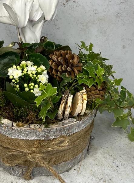 A pretty festive Christmas Planted Basket with cyclamen, Ivy, kalancho and festive decoration. A perfect present for the plant lover.