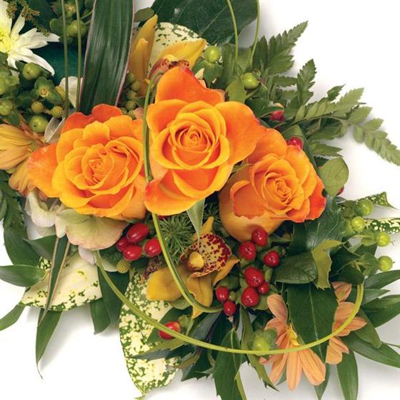 Loose cross including Roses, Gerbera, Chrysanthemums and complementary foliage.