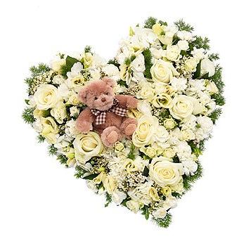 A classic white Rose and Hydrangea heart with an adorable bear. Tribute size is 14".